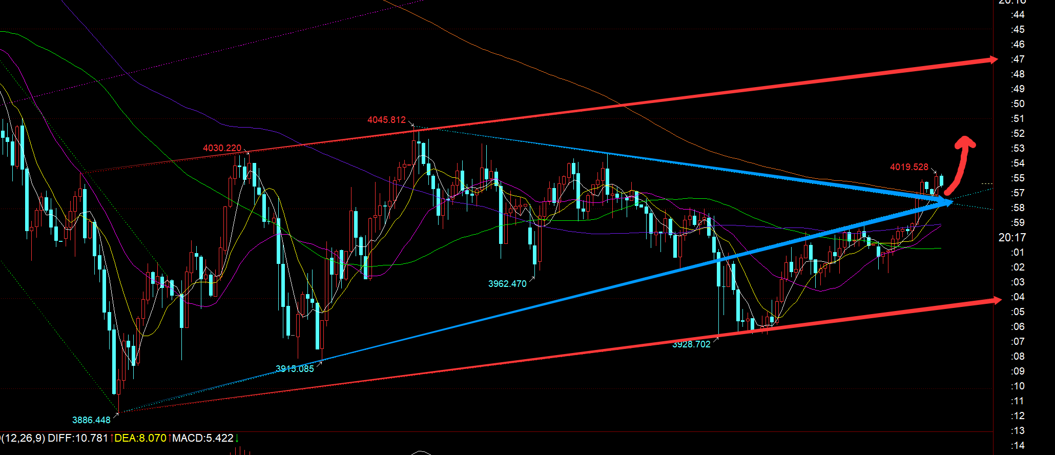 第三,黄金小时线级别:隔夜仍压制上图蓝色收敛三角下轨反压阻力3990下,早间先出现一波下探,失守中轨,以及昨日早间低点和欧盘低点趋势连接线,但并未延续下探,而是出现一路连阳走高,欧盘期间甚至突破了3990重要阻力位,突破了收敛三角阻力位,此时也突破了年均线压制位,因此今晚就跟随市场去继续看涨即可,当前支撑则是4004-06之上,基本上只要守住4000关口,大概率还会维持反弹拉升,阻力4030、4050,强压就是红色通道上轨4080; 只有冲破红色通道上轨压制点,那么才能短期走强,去冲一个次高点;