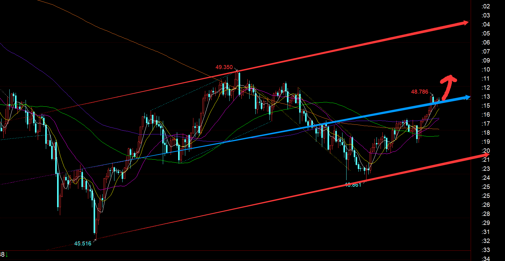 白银方面:日线今日也是冲破了10均线,也有望走出底部偏弱的整理范围,向上去测试中轨49.4一线,只有突破站上它,才能打出一个次高点51及上方; 短期从上图看,整体也和黄金一致,处于红色大通道内宽幅运行,而蓝色线是9月初一路单边支撑起来的趋势线,当前也有所上破,作为日内算是小单边偏强拉升走势来看,就不能等太多回测,不然容易打回震荡;因此,欧盘回踩的低点48.5一线就最好不能再下破,上方阻力目标留意49、49.4,关键还在于49.4压力能否一举拿下;