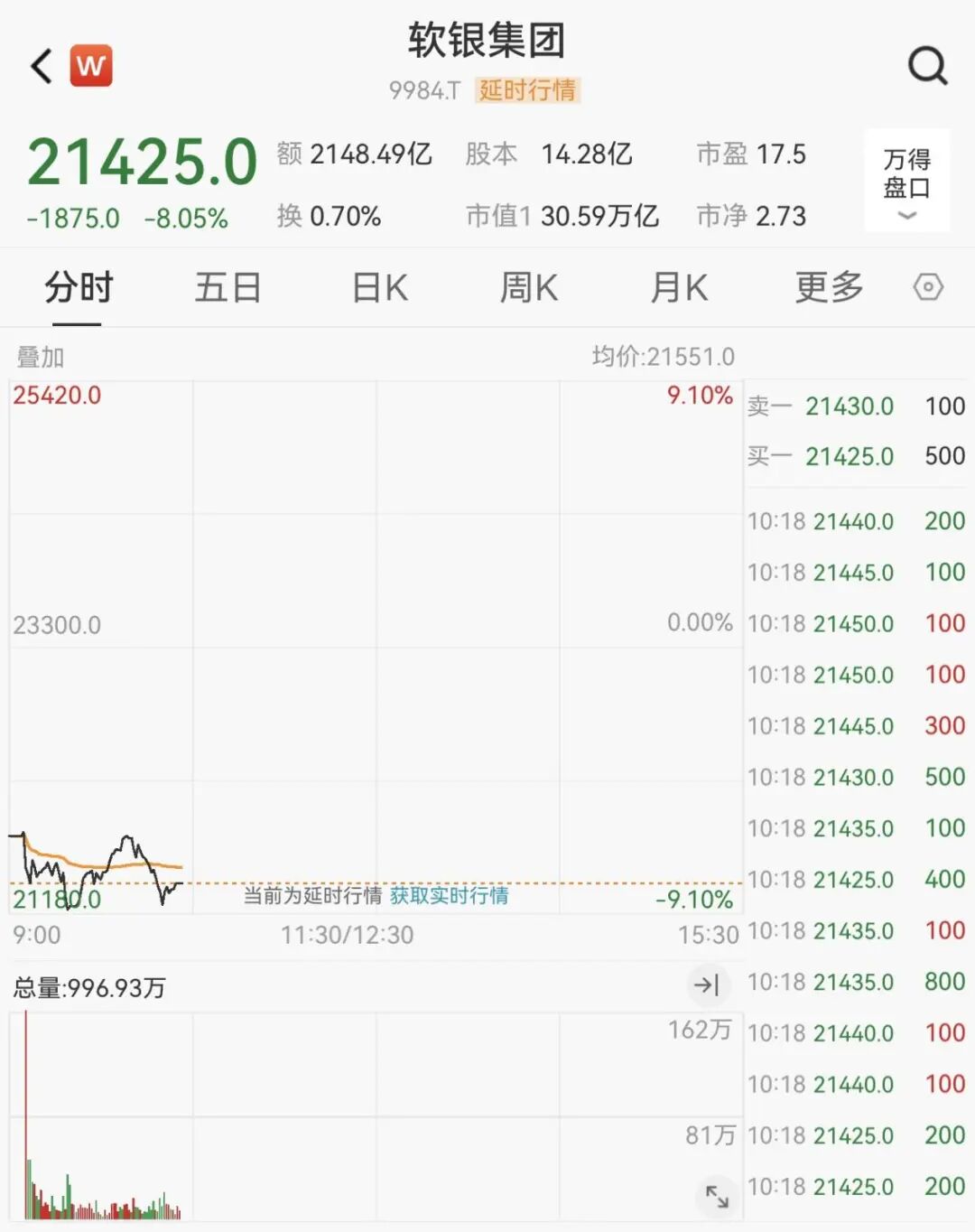 隔夜美国科技股大跌,软银集团股价跌超8%,爱德万测试股价跌超6%