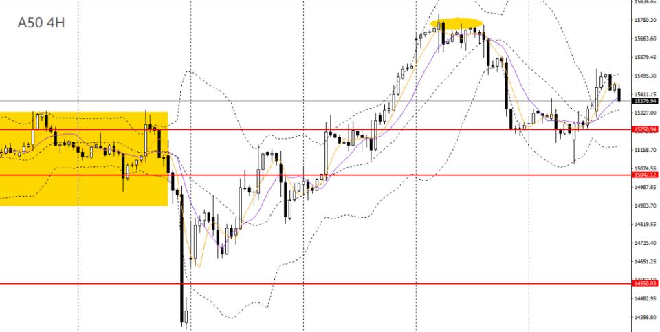 A50继续走高,日线RSI站上50,4小时触及15500一线遇阻,多头动能减弱,如无法正式升破,多单建议离场,稳健者可暂时观望。