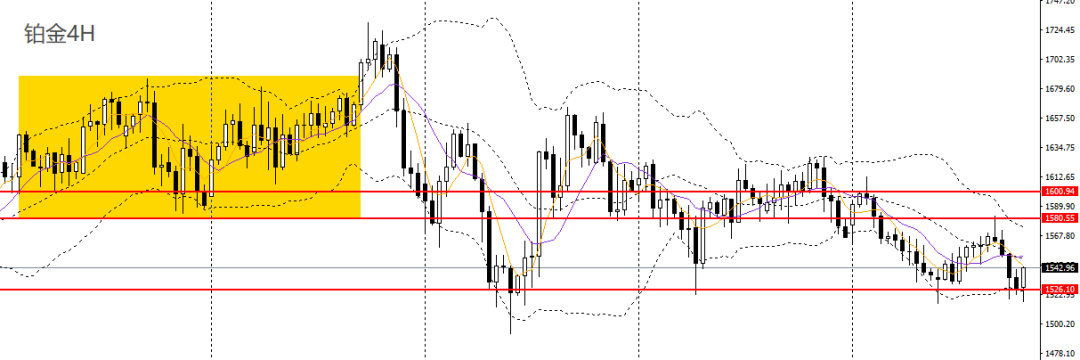 铂金震荡回落,4小时再度下探1520一线支撑,且继续承压于1580下方,如守稳1520支撑,短线空单可暂时离场。