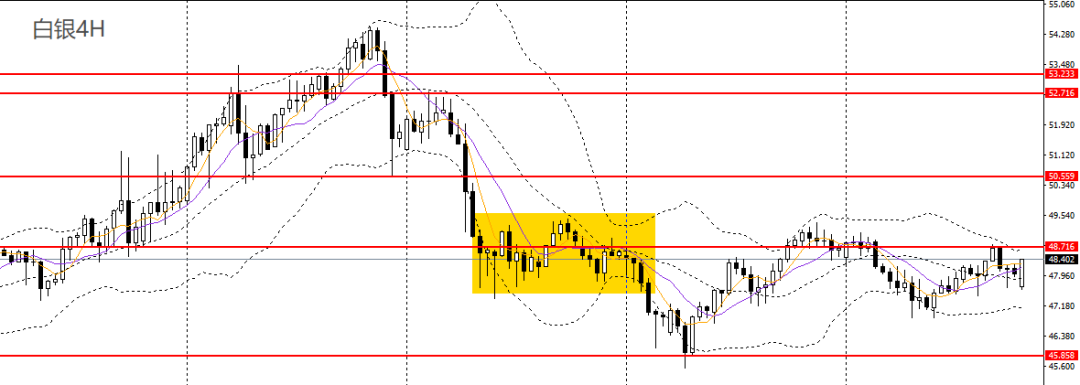 白银昨日收十字星,5日、10日均线仍交错粘合,4小时守住47关口,短线趋势重新转多,多单可继续持有,后市有望上探48.70。
