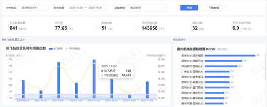 昆航当前执飞航线51条,一周内执行航班841班次,平均日出港约50班。