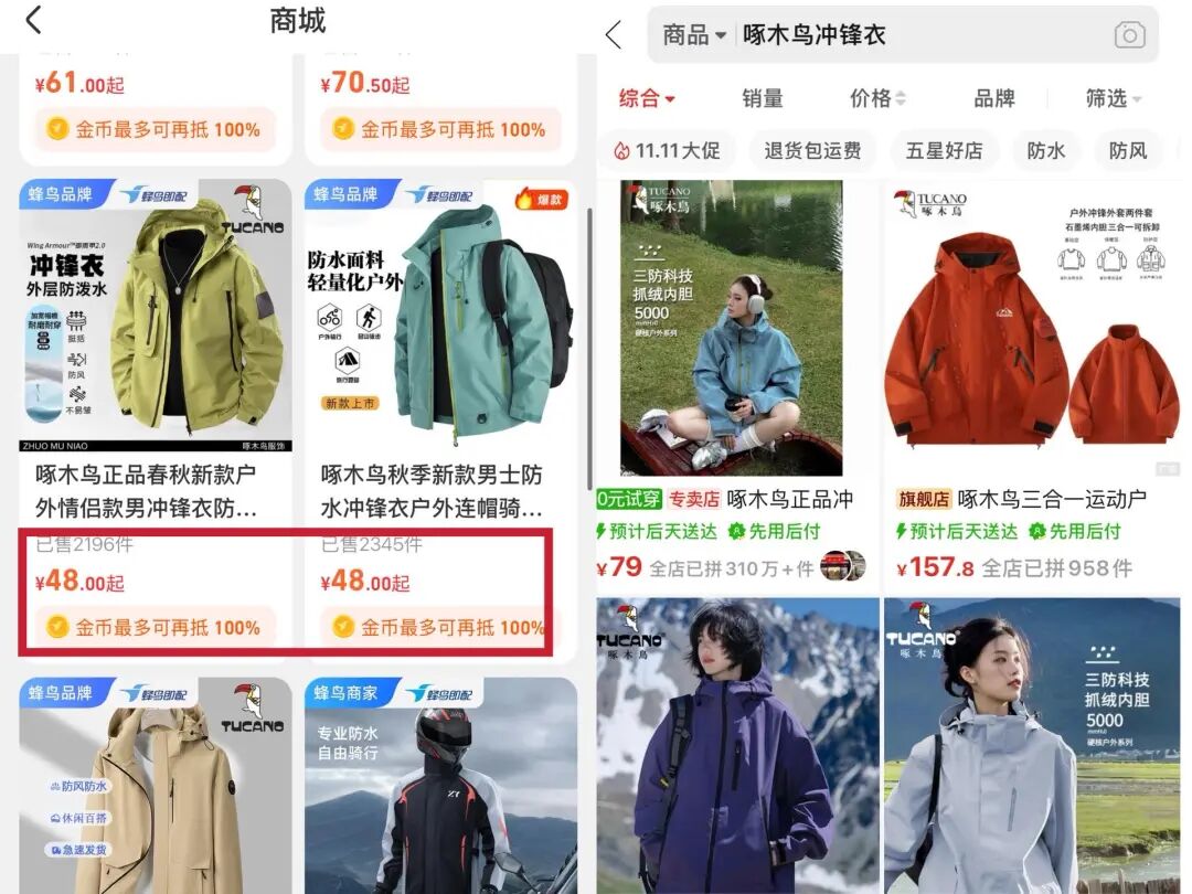 打开蜂鸟众包的骑手商城搜索“冲锋衣”,比起动辄几百上千的户外大牌,这里的价格只需要48元,就连能一衣三穿的三合一冲锋衣也仅需115元。以啄木鸟冲锋衣为例,单品价格甚至比主打性价比的拼多多更加划算。
