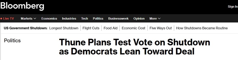美国彭博社报道称,参议院共和党领袖约翰·图恩(John Thune)表示,一项协议“正在逐步达成”,他计划在周日就一项旨在结束长达40天的政府停摆的支出方案进行试探性投票。
