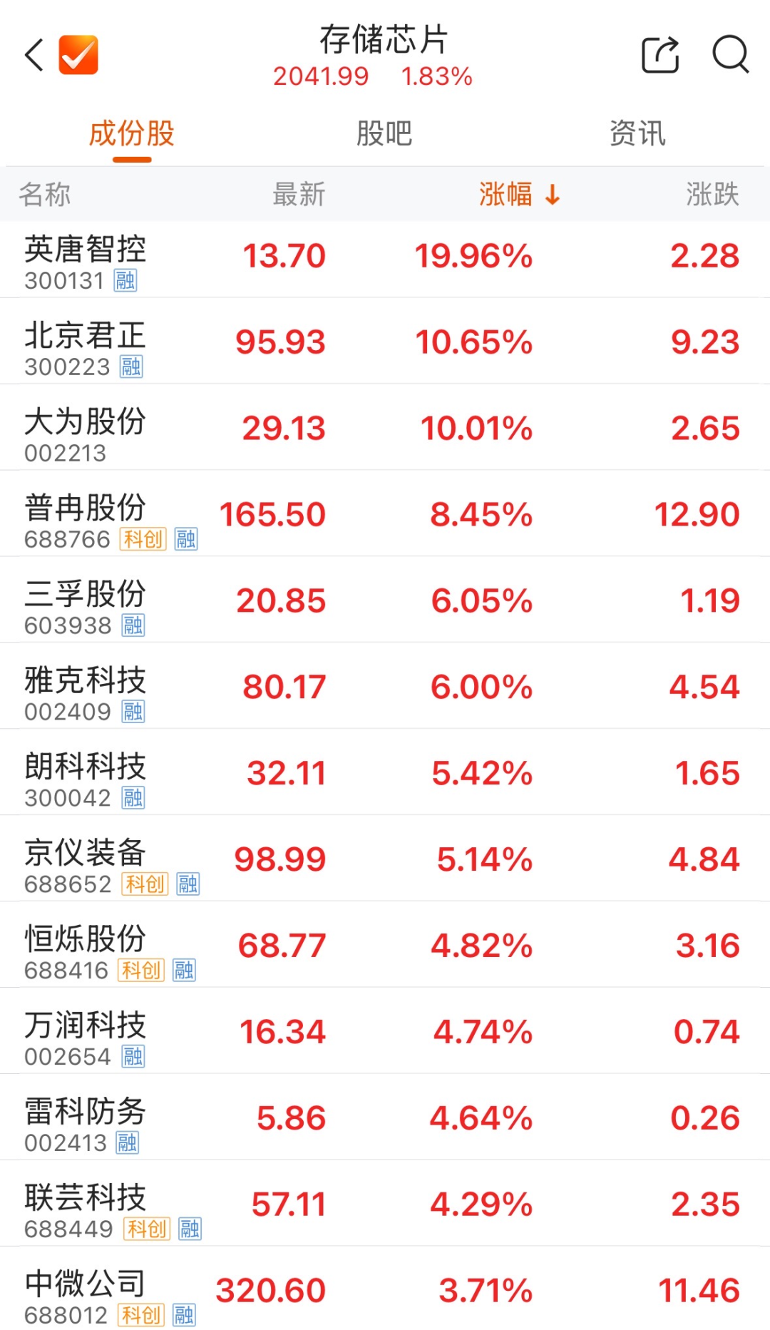 存储芯片板块表现活跃,英唐智控“20cm”涨停;普冉股份涨超8%,股价创历史新高;香农芯创、江波龙、开普云、朗科科技等集体高开。消息面上,存储芯片大厂闪迪宣布大幅上调NAND闪存合约价格,涨幅高达50%。美股市场上,闪迪11月7日因数据中心存储芯片销售强劲而大涨超15%,股价再创历史新高。