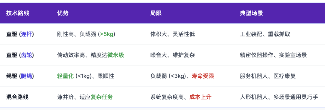 灵巧手的传动机制主要分为三类:直驱(连杆或齿轮)、绳驱(腱绳)、以及混合方案。