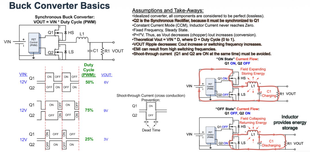 从原理上看,同步Buck转换器通过控制开关器件Q1与Q2的导通与关断,以PWM方式调节输出电压。