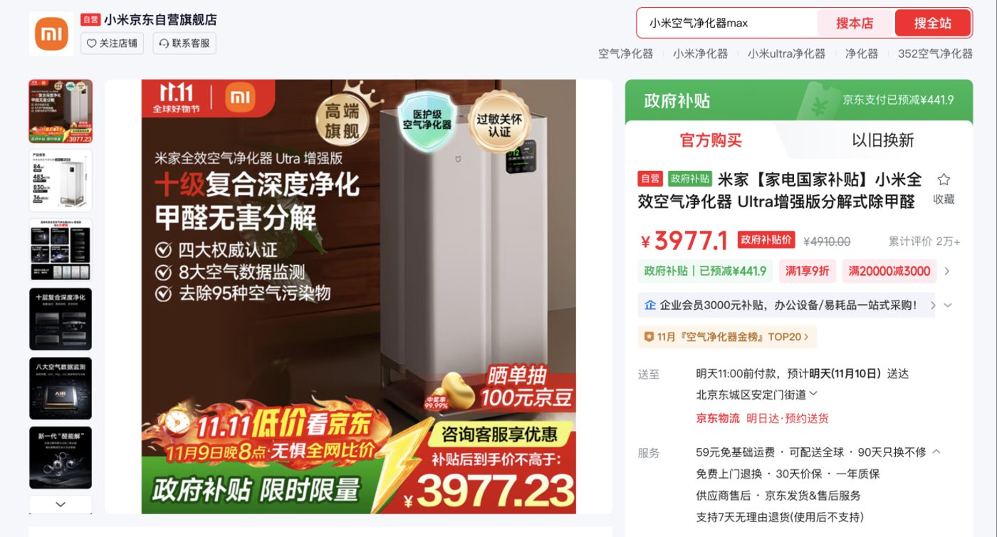 秋冬干燥,空气中颗粒物增多,呼吸道更需呵护。小米全效空气净化器 Ultra 增强版,创新十级复合深度净化,可有效分解甲醛、二手烟、除细菌、病毒等95种常见污染物,保持室内空气清新自然。京东11.11期间限时9折,叠加国家补贴8折,到手价3977.1元。