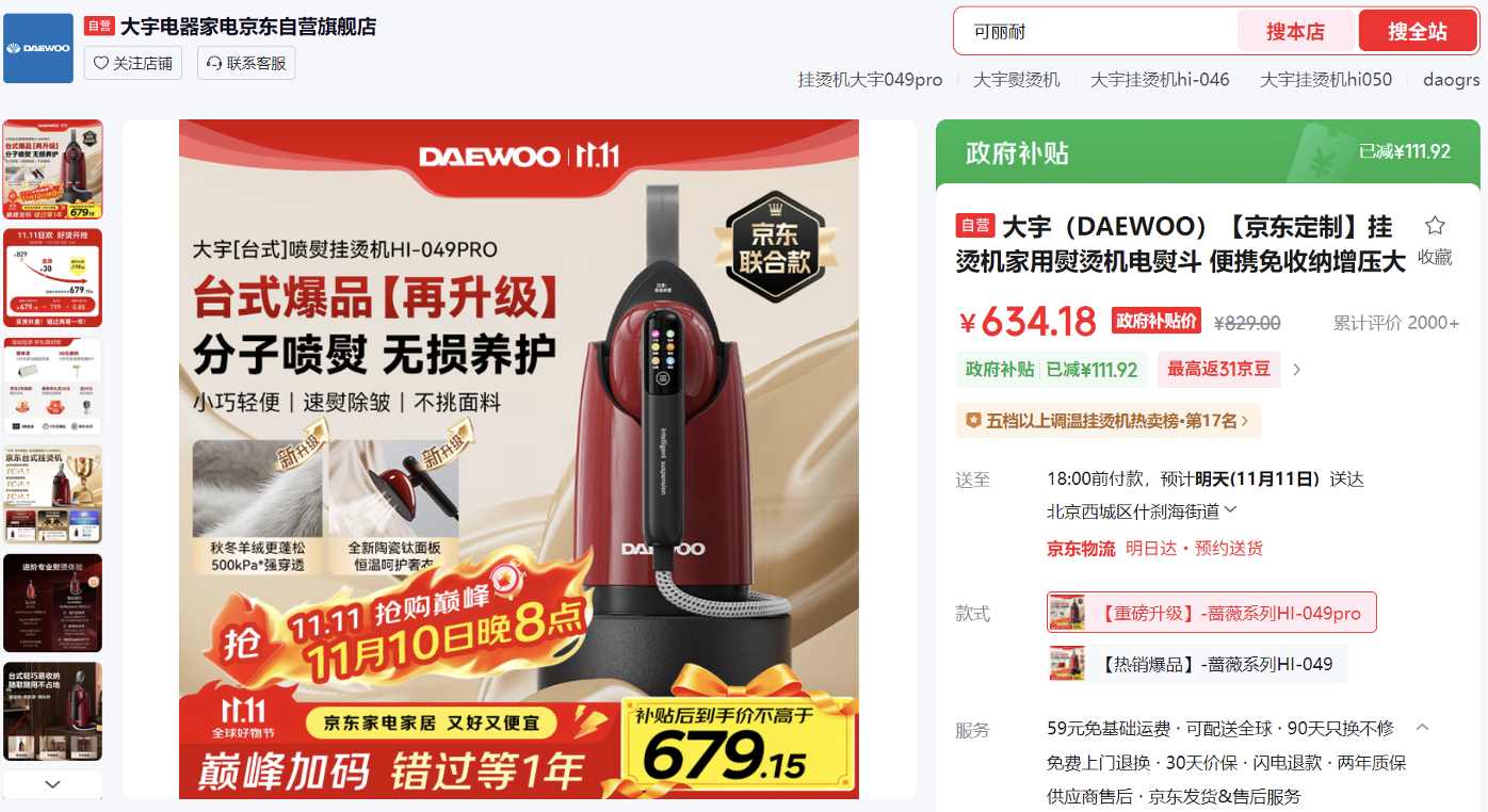 秋冬衣物收纳太久易起皱,大宇京东定制款挂烫机,全新升级分子喷熨技术,高效除皱更护衣,羽绒服也能熨出蓬松感。京东11.11期间下单享双重补贴,到手价634.18元,晒单送熨衣板。
