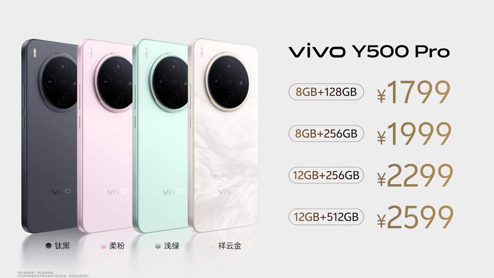 共有四款颜色可选的vivo Y500 Pro即日起开启预售,将于11月14日正式上市,8GB+128GB版1799元,8GB+256GB版1999元,12GB+256GB版2299元,12GB+512GB版2599元,叠加国补优惠至高减390元。添加科客公众号kekebat,获取更多精彩资讯。