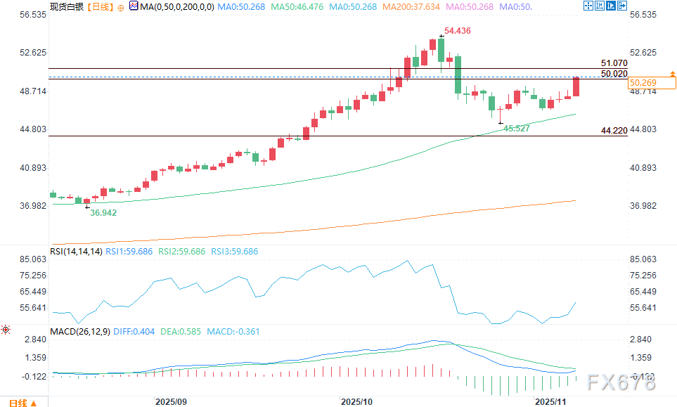 —周一(11月10日)美盘时段,现货白银大幅上涨,多头突破10月31日创下的49.38美元震荡高点,推动短期趋势转涨并触及50.02-51.07美元回调区间。目前市场维持在该区间底部附近,尚未对区间上沿发起有效冲击,当前白银价格仍较主要阻力位低约1美元。