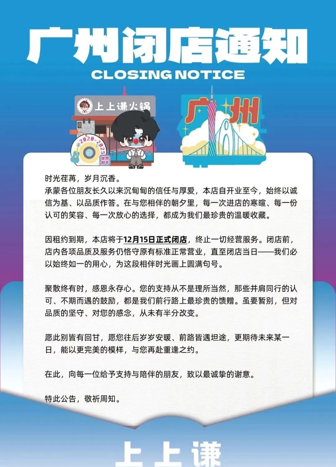 其中提到,上上谦广州店因租约到期,将于12月15日正式闭店,终止经营服务。