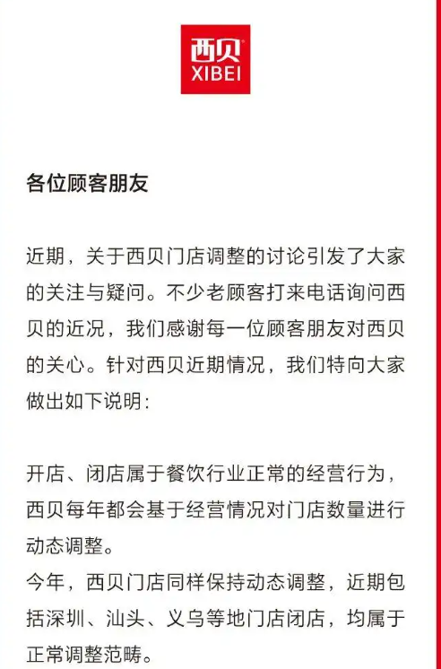 11月11日,针对近期“西贝闭店潮”传闻,西贝发布官方声明回应称:开店、闭店属于餐饮行业正常的经营行为,西贝每年都会基于经营情况对门店数量进行动态调整。西贝近期持续升级服务、调整菜品、优化价格,年内还将开店8家。