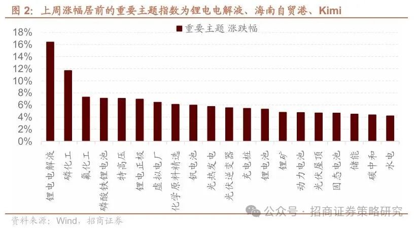 上周,A股涨幅居前的重要主题指数为锂电电解液、磷化工、氟化工。