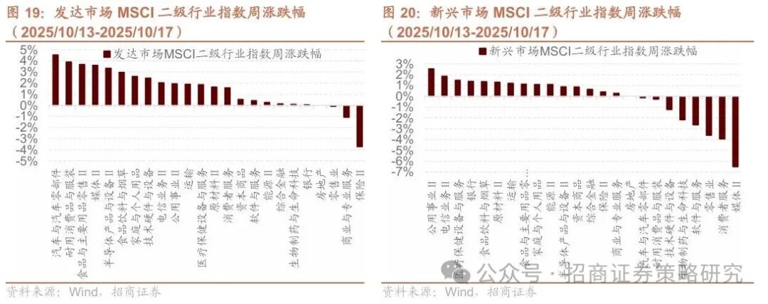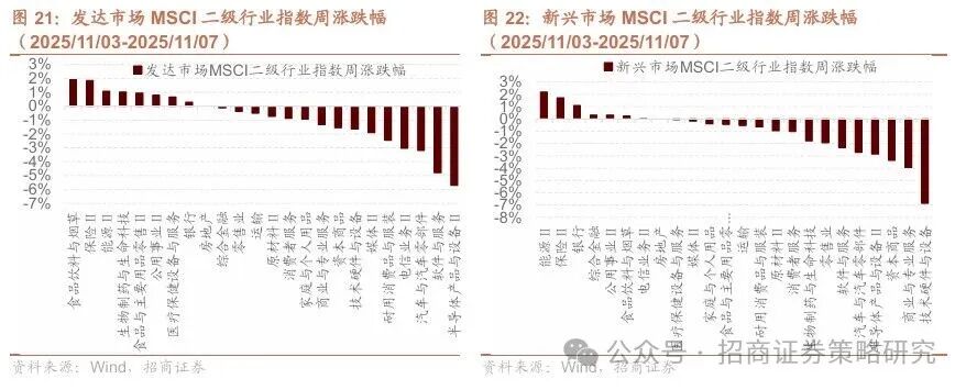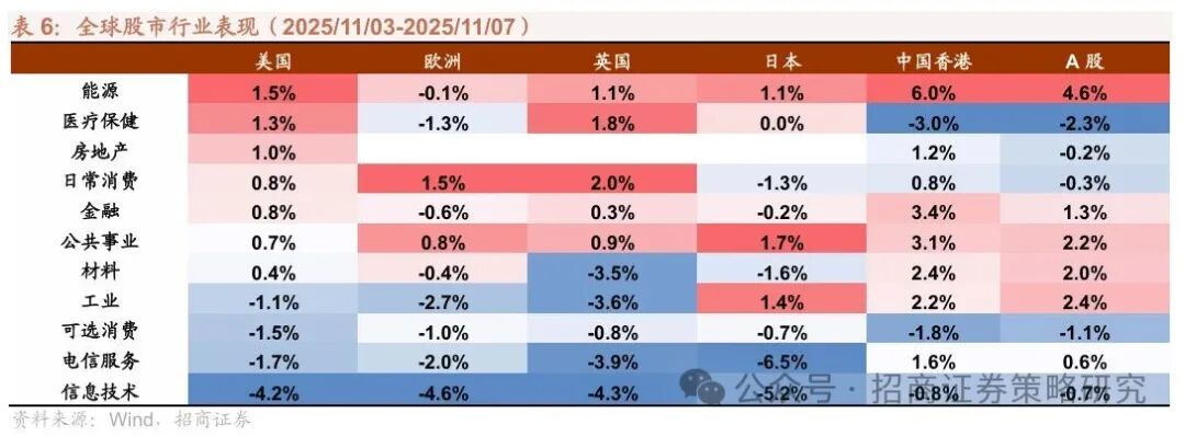 上周全球股市涨跌互现,能源表现较好,电信服务和信息技术表现不佳。具体来看,美股涨多于跌,能源小幅领涨,信息技术明显拖累指数;欧股跌多于涨,日常消费上涨最多,信息技术明显领跌;英国股市涨跌互现,日常消费领涨,信息技术下跌最多;日本股市跌多于涨,公共事业小幅领涨,电信服务下跌突出,信息技术亦下跌显著;港股涨多于跌,能源强势拉升,医疗保健有一定回调;A股涨跌互现,能源上涨明显,医疗保健领跌。