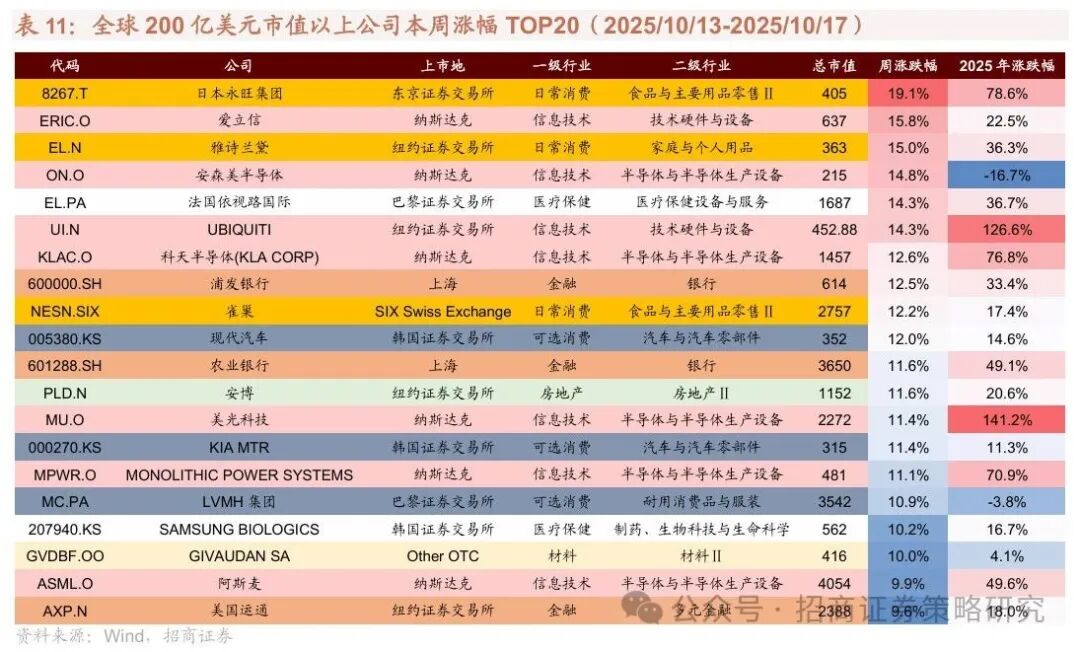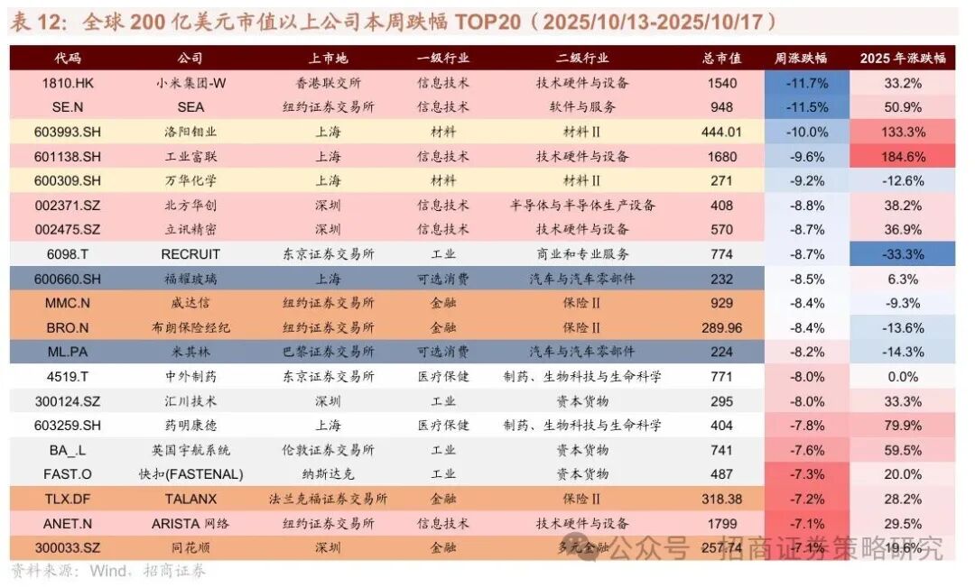 过去一周领涨的200亿美元以上市值公司中,资本货物居多;过去一周领跌的200亿美元以上市值公司中,软件与服务居多。