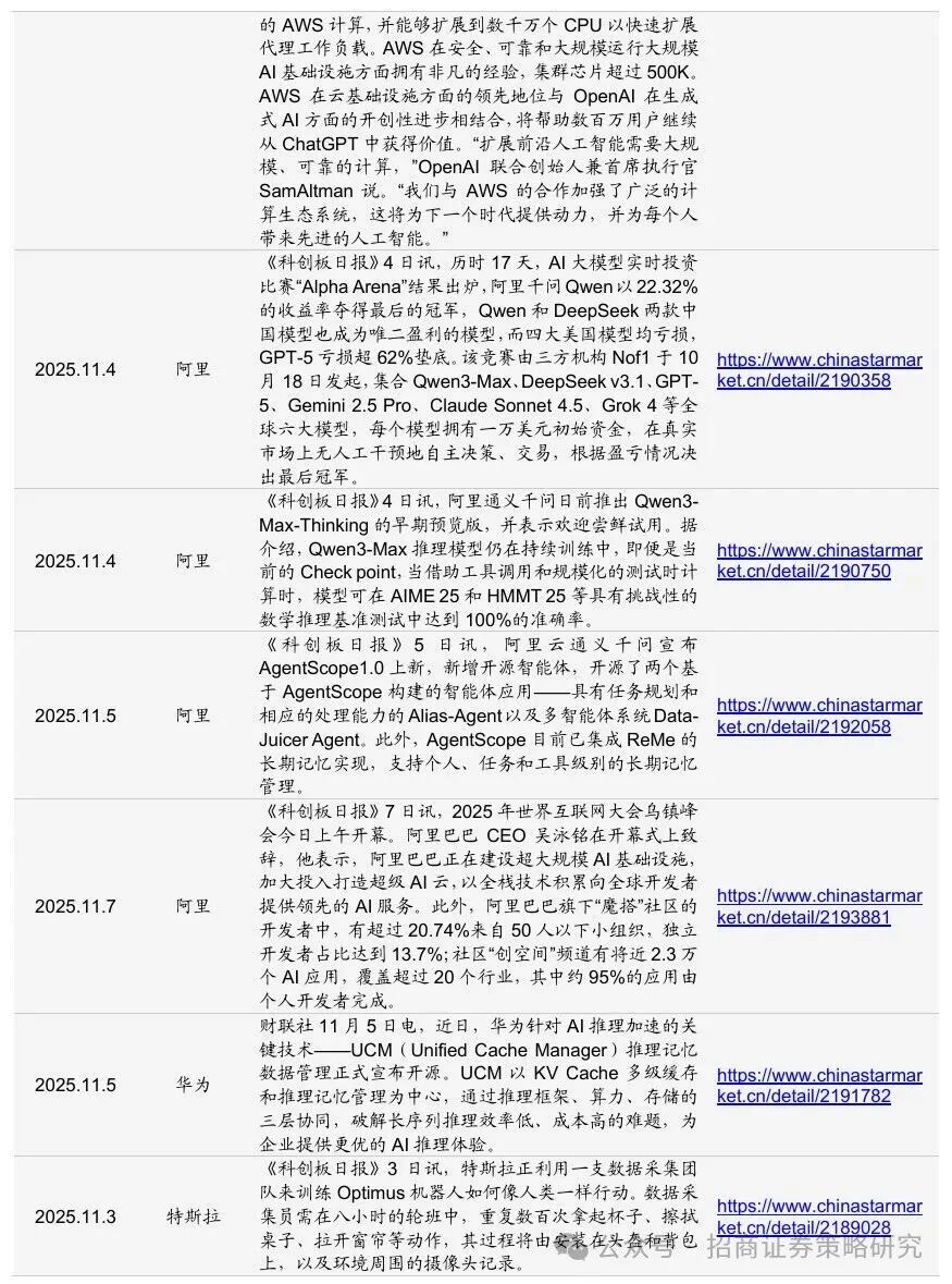 人形机器人方面,特斯拉11月7日在股东大会公布Optimus擎天柱机器人最新量产计划;11月5日,小鹏发布女性机器人IRON,全面展示其在“物理AI”领域的最新布局;乐聚智能“夸父”亮相全运会,AI与机器人融合已显现加速迹象,人形机器人产业化进程加速。
