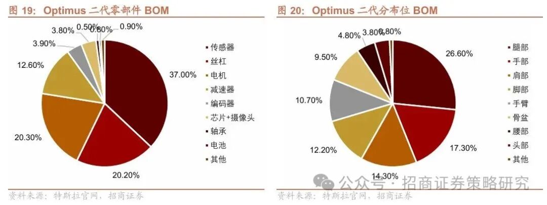 从功能维度拆解成本结构,腿部与手部是成本最高的两个系统,合计超过四成。腿部系统成本约占26%,涉及多自由度驱动与平衡控制,是整机运动能力的核心;手部约占17%,对应精密操作与灵巧手结构,是最复杂的机械子系统。肩部成本约14%,与手臂、腰部、骨盆等结构协同,实现灵活的上肢运动;脚部约占12%,主要用于动态平衡与地面反馈。头部部分集成了摄像头、传感器与计算单元,约占4%;腰部与骨盆承担结构支撑与重心调节,合计约15%。整体结构表明,人形机器人造价集中于运动驱动与操作执行系统,而轻量化材料与模块化设计将成为后续成本下降的主要方向。