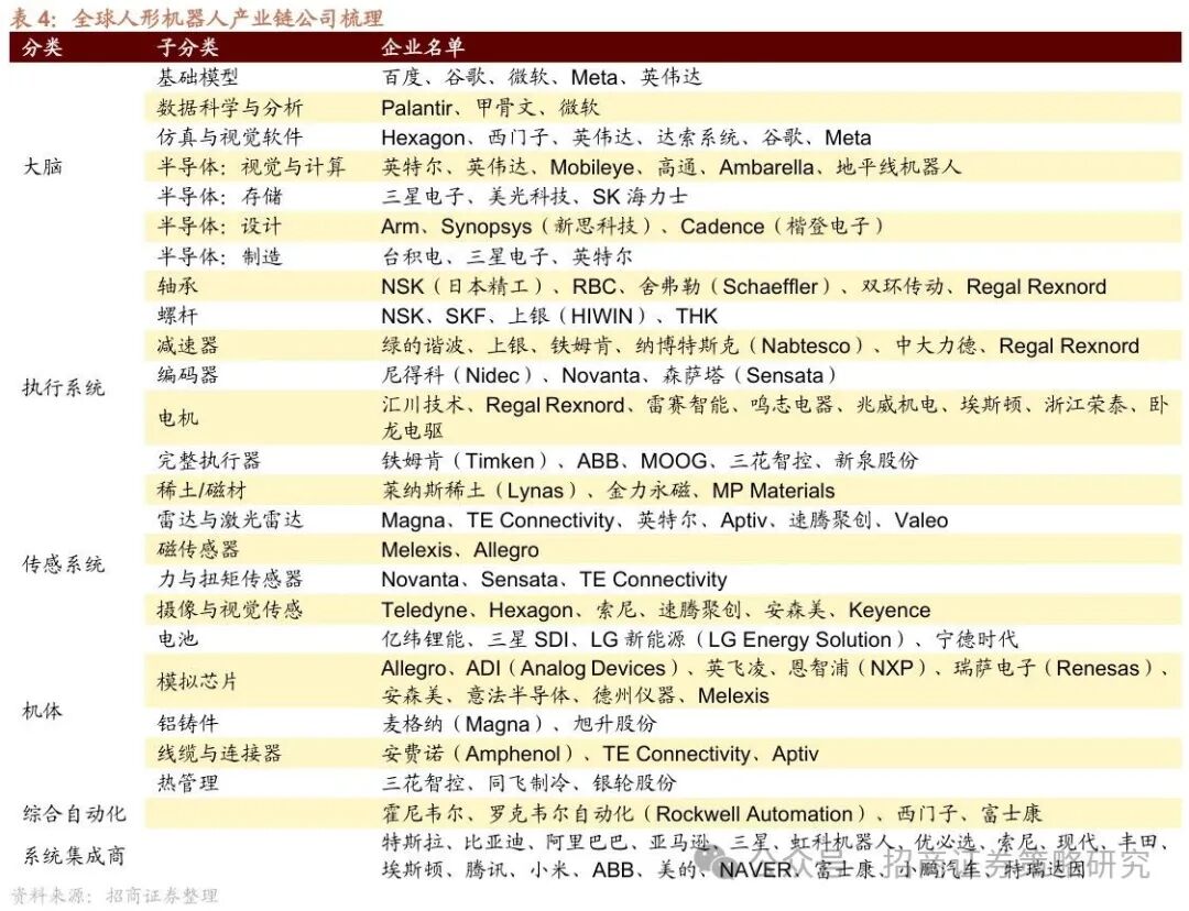 人形机器人产业链整体可分为“大脑—身体—整机集成”三大环节。上游集中于AI芯片、算法与运动控制系统;中游涵盖传感器、电机、减速器、丝杠、轴承、结构件等核心机械零部件;下游由整机厂完成软硬件集成、算法训练与应用落地,覆盖制造、物流与服务等场景。整体来看,产业链价值主要集中于中游核心部件环节,而上游算法系统构成了未来差异化竞争的关键。