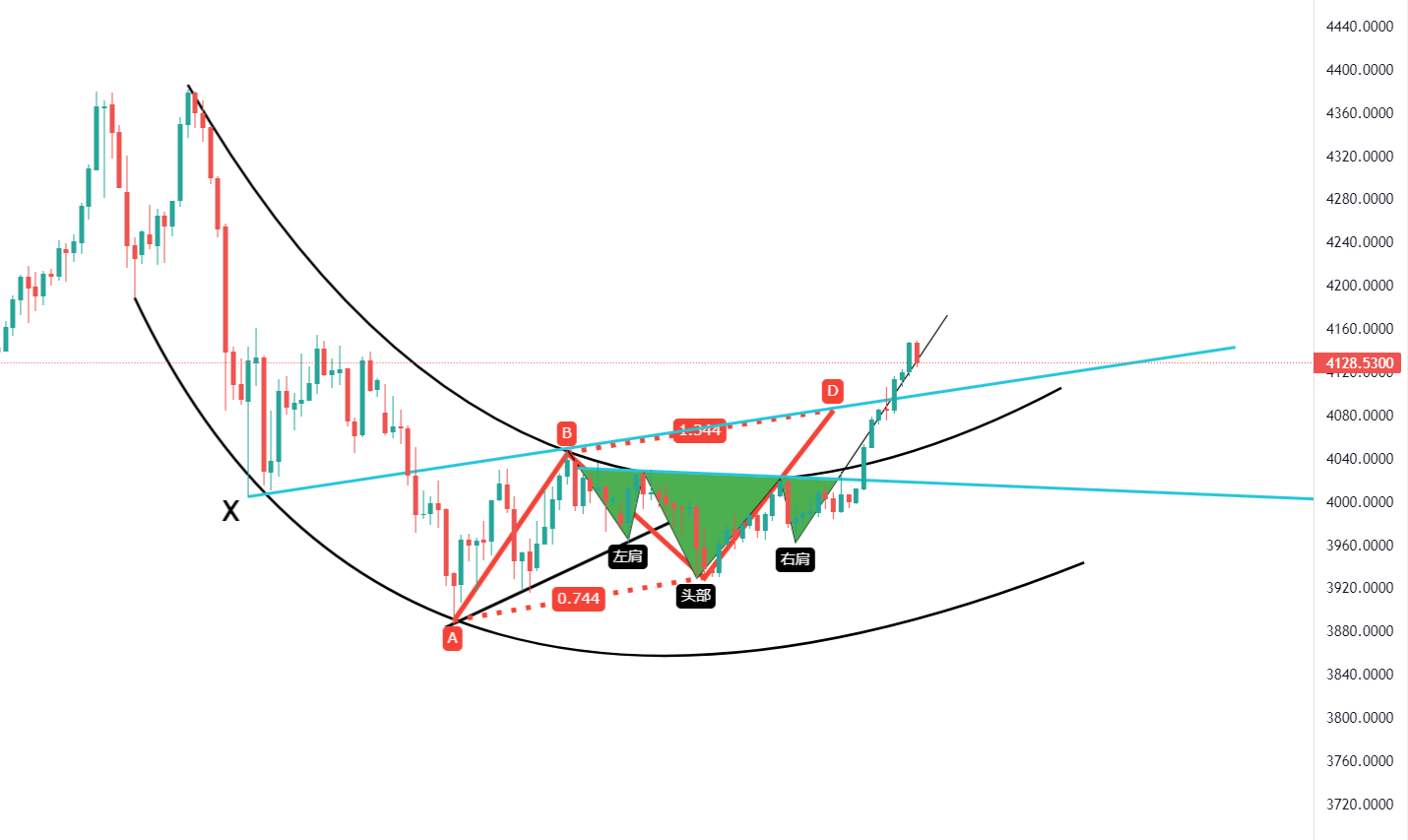 之后,红色的ABCD见底形态就出来了,第一次三角形就是在3880到4050,随后回落的3930,右侧确实有上涨,但我上面也说了,一直受压在通道内上不去,如果想要形成AB=CD的见底形态,价格就需要拉到4080才行,上周你们也知道,别说4080了,连个4030都突破不了,这不是明摆着给我传递形态失败的信息吗?可是,周一直接上去了,就是这个意外,组合了AB=CD的确立,见底形态由此形成。
