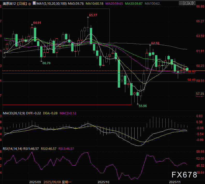 周二(11月11日)亚欧时段,油价继续调整,目前油价回踩至5日线之上,跌0.52%,交投于59.79附近。