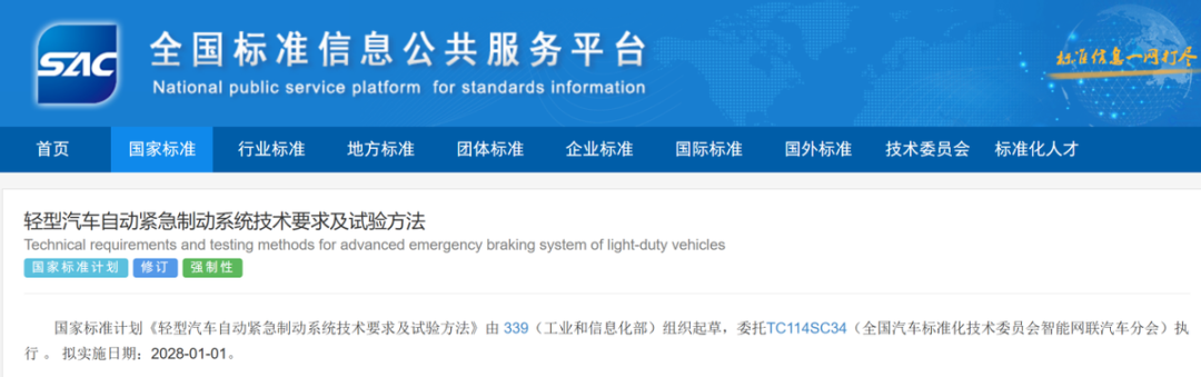 这项标准将替代现行的GB/T39901-2021,从推荐性标准升级为强制性标准,要求所有M1类(乘用车)和N1类(轻型载货汽车)装备自动紧急制动系统。