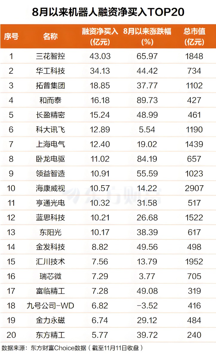 东方财富Choice数据显示,8月以来,杠杆资金抢筹多只机器人板块概念股,其中三花智控排名第一,融资净买入超43亿元,8月以来涨幅接近66%;华工科技排名第二,融资净买入34亿元,8月以来涨幅超44%。