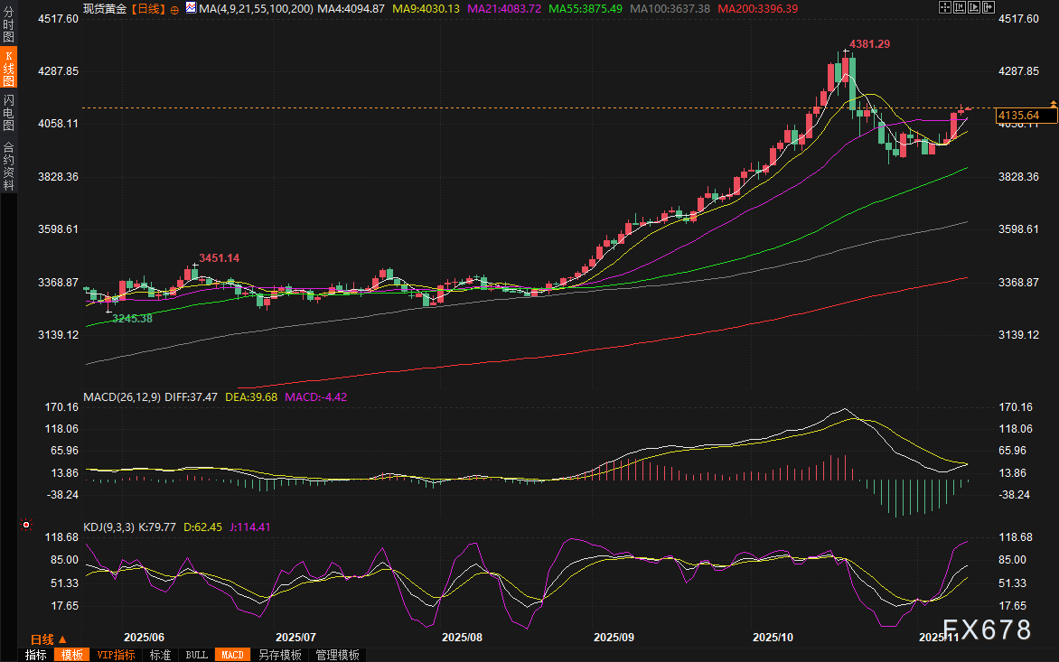投资者需要留意美国政府停摆相关消息,另外,纽约联储主席威廉姆斯、费城联储主席保尔森、美联储理事沃勒、亚特兰大联储主席博斯蒂克、波士顿联储主席柯林斯本交易日将分别发表讲话,投资者需要关注。技术面来看,10月22日高点4161.05附近阻力较强,如果顶破该位置,金价后市有望再度向历史高点4281附近位置发起冲击。下方短线留意21日均线4083附近支撑。汇通财经APP讯——周三(11月12日)亚市早盘,现货黄金震荡微涨,目前交投于4135美元/盎司附近,守住了前几个交易日涨幅。金价周二上涨0.27%,收报4126.62美元/盎司,盘中最高触及4148.91美元,创下10月23日以来新高,美国政府停摆即将结束、经济数据恢复在即、以及美联储内部鹰派转鸽的明确信号,共同点燃了黄金市场的多头火焰。