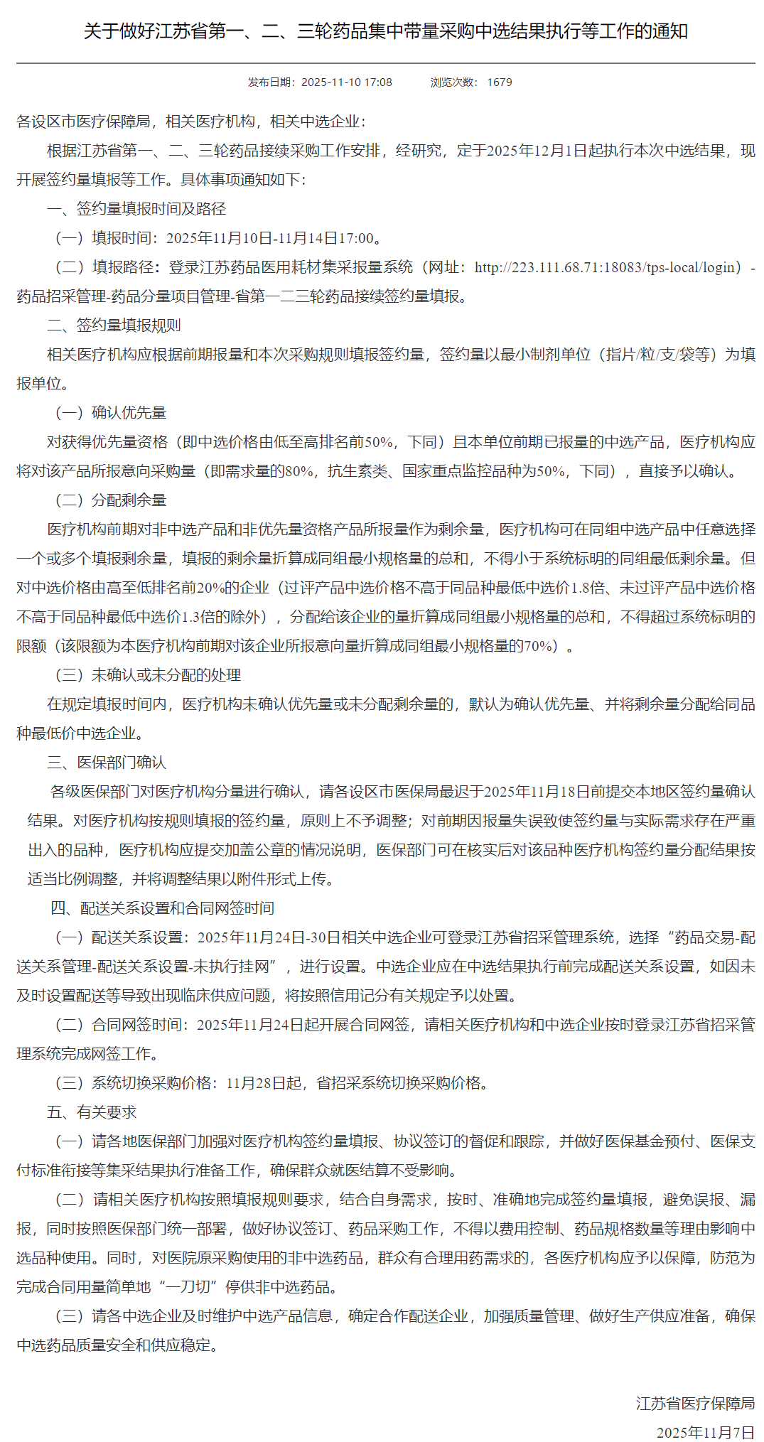 江苏省医保局发布重磅通知,明确江苏省第一、二、三轮药品集中带量采购中选结果将于12月1日起正式执行!