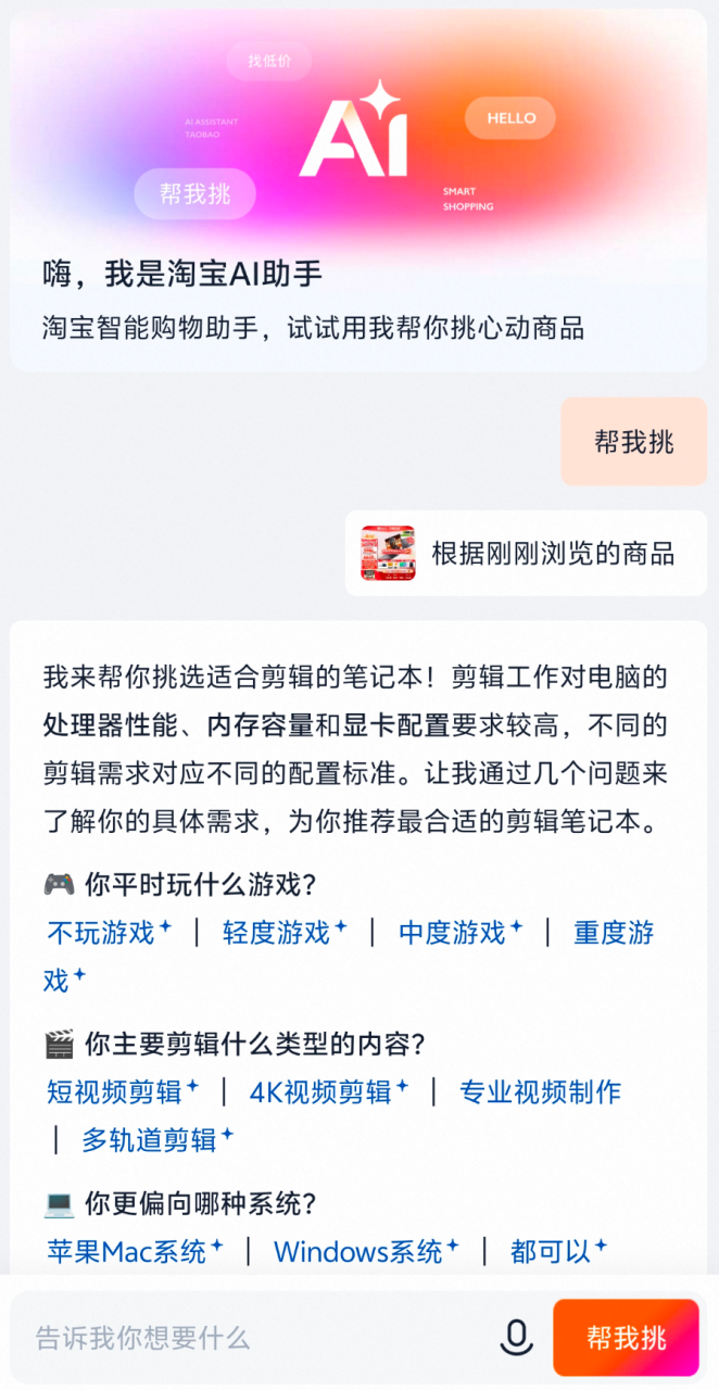 “AI帮我挑”则构建的是个类导购陪伴的深层偏好挖掘场景。它通过多轮对话引导,像线下导购一样逐步明确用户需求,最终锁定用户的精准消费意图。实测下来AI在辅助购物决策的时候,考虑的因素要比个人拍脑袋全面得多,简直是“选择困难症患者”的最佳购物搭档。搜“剪辑游戏本”,它会询问包括:主要剪辑内容、系统偏好、预算范围、便携性考量等一堆内容,完整复刻并加强了前不久帮表弟挑电脑时我本人的思考过程。