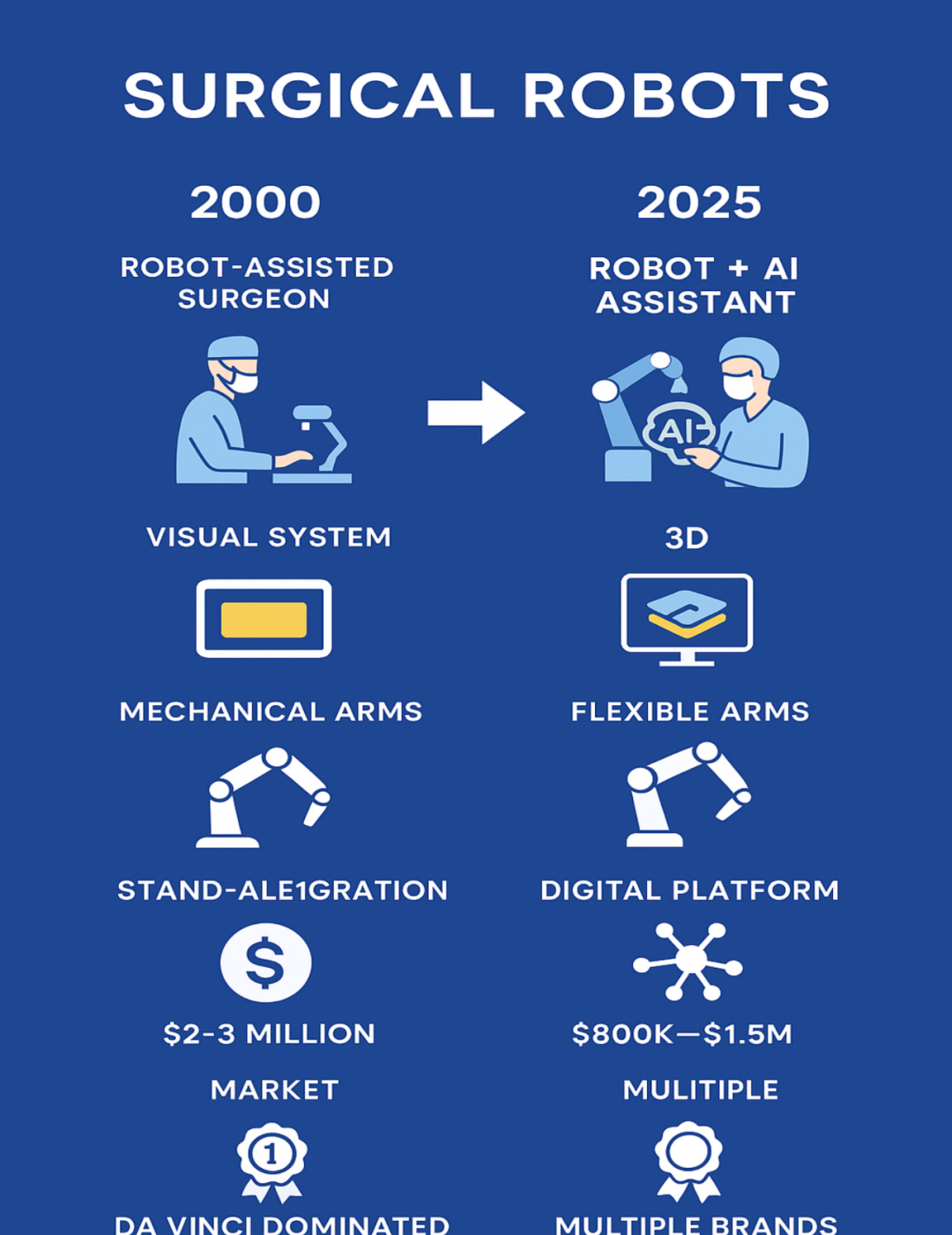 现在的手术机器人,和25年前的产品相比,最大的进步是:之前它是一只医生的“延长手”(100%人控),而现在是一个“AI助手”,能半自主地完成部分辅助任务,如缝合。