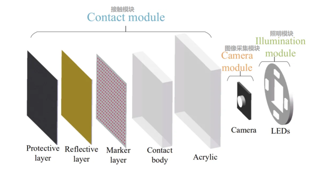 1)接触模块:物理交互的“感知前端”。主体为柔性透光材料(如硅胶、水凝胶、弹性聚合物),内部嵌入微米级标记点。物体接触时产生弹性形变,通过内部标记点的位置偏移、形状变化,将物理接触信号(压力、剪切力、滑移)转化为可观测的结构变化。