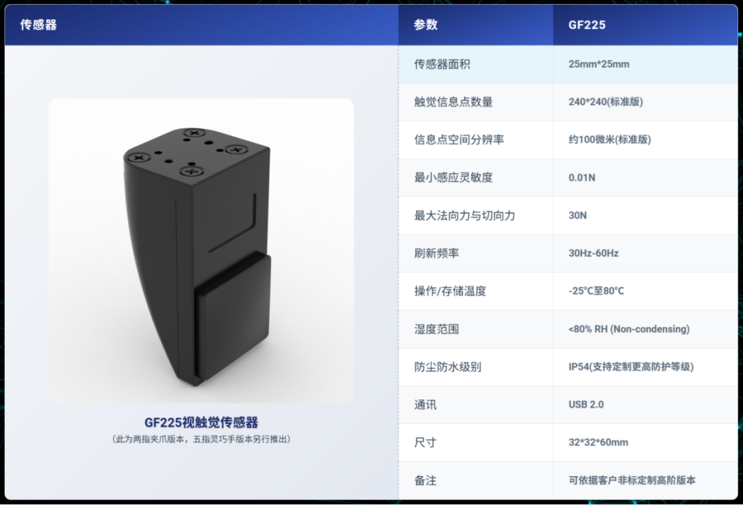 GF225视触觉传感器参数信息(来源:纬钛机器人官网)