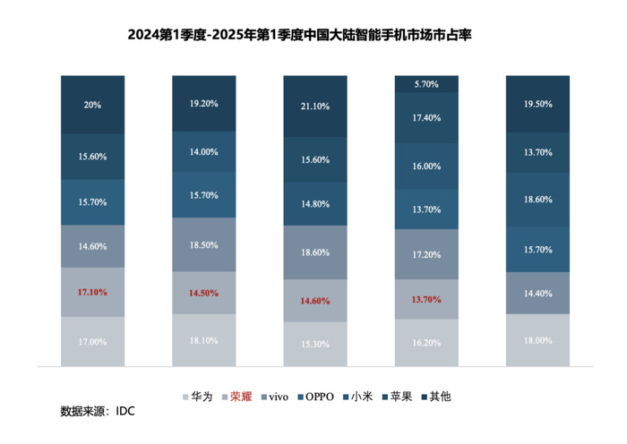 2024年四季度,荣耀在中国手机市场的市场份额已经下滑至13.7%,同比下降14.9%。进入2025年一季度,荣耀市场份额继续萎缩,跌出了前五名,这意味着荣耀的市场份额比第五名的13.7%还要低。