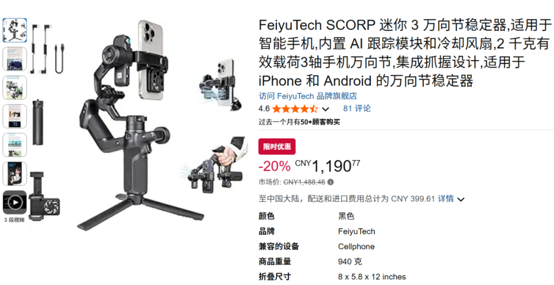 作为对比,专业云台厂商FeiyuTech,则为智能手机云台配备了内置风扇,来支持设备的长时间拍摄。