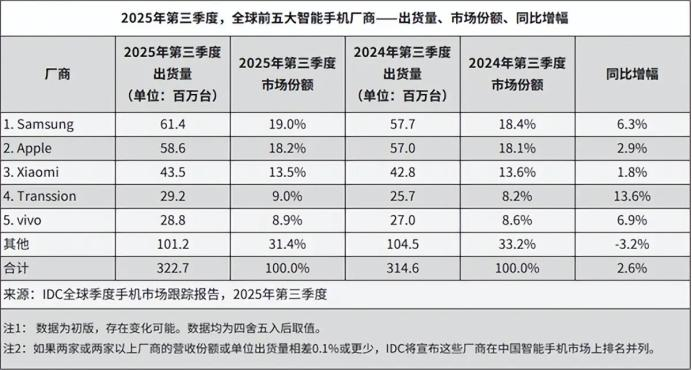 IDC数据显示,2025年第三季度,vivo的市场份额为17.3%,依然保持领先地位;苹果以15.8%的市场份额排名第二;华为排第三,市场份额为15.2%。小米、OPPO、荣耀分别排名第四、第五和第六,市场份额分别为14.7%、14.5%和14.4%。