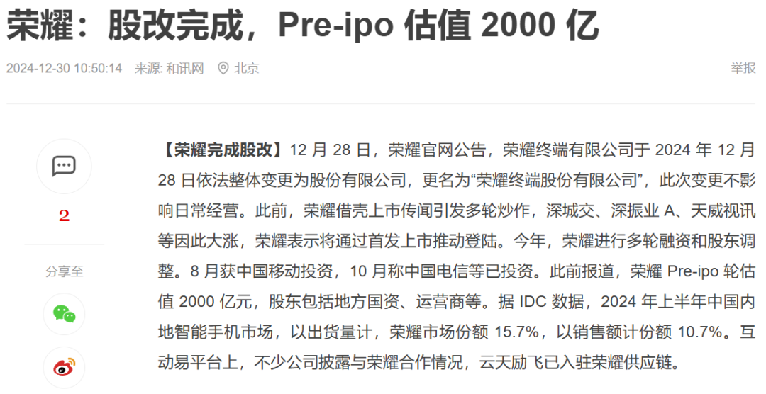 在Pre-IPO轮融资中,荣耀约2000亿元的估值相较其从华为剥离时(2600亿元)已出现约23%的缩水,直观反映了投资者在为其宏大梦想买单时的审慎与犹豫。