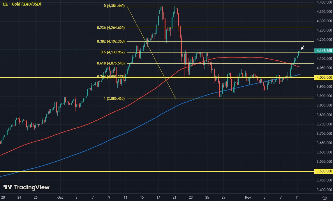 目前金价的上涨使其挑战10月底跌势的50%斐波那契回调位。此前金价从约4,350美元暴跌逾10%至3,900美元附近,如今已反弹约6%。