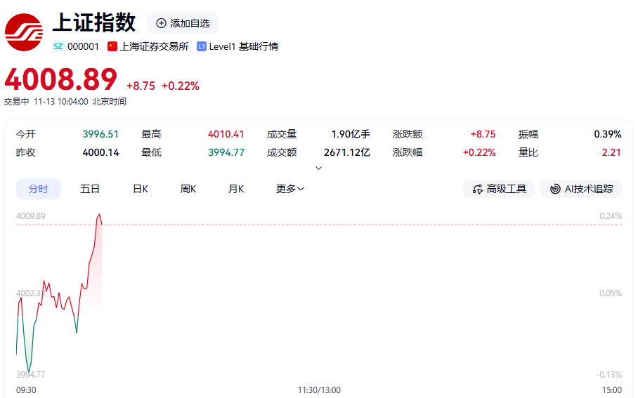11月13日,A股主要指数低开高走,沪指、深证成指等集体翻红。截至发稿,上证指数上涨0.22%,报4008.89点;深证成指上涨0.68%,创业板指上涨0.66%,北证50指数涨超2%。