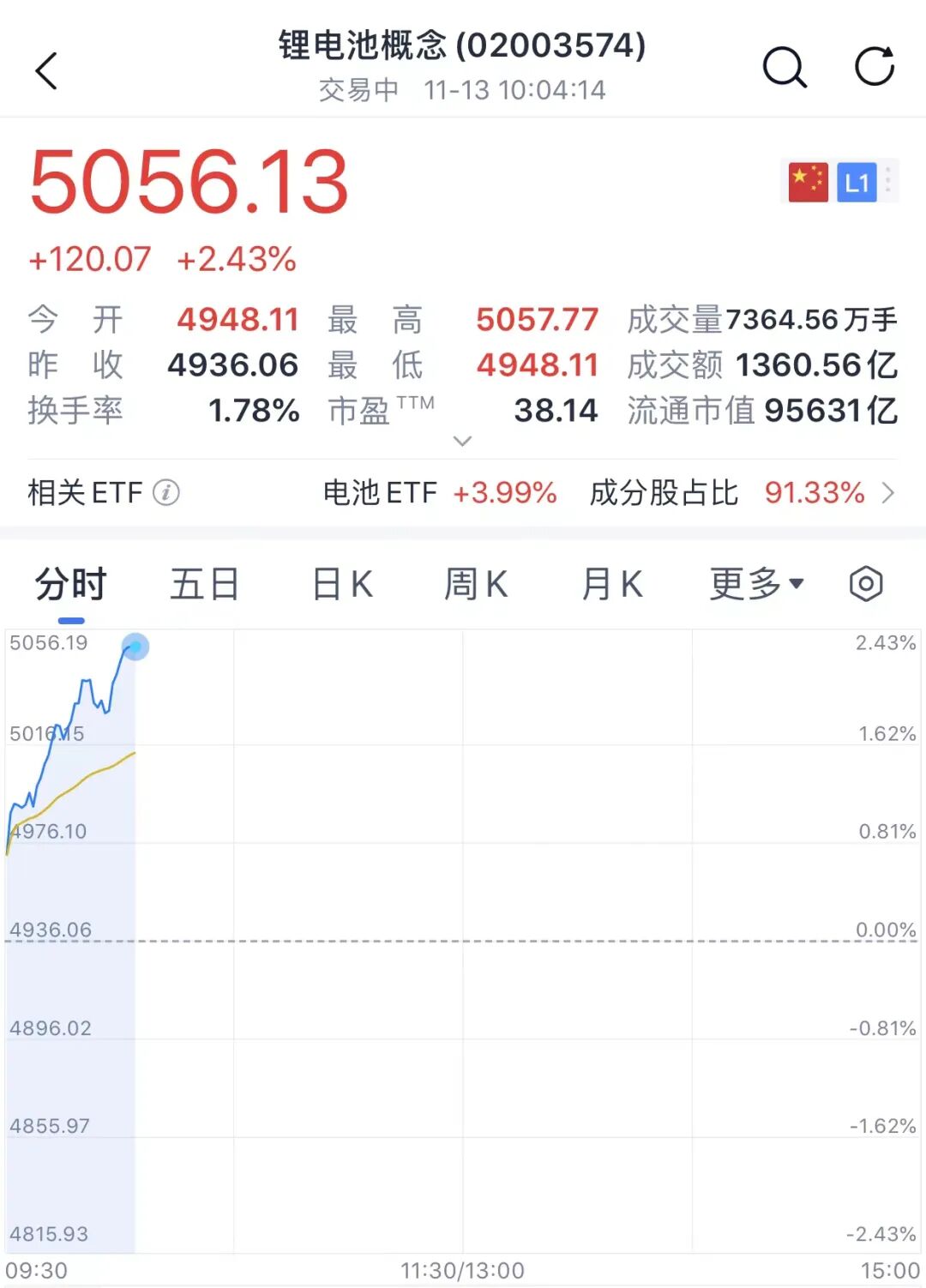 盘面上,锂电池概念飙升,截至发稿,该概念指数涨超2%,成为今日市场亮点之一。