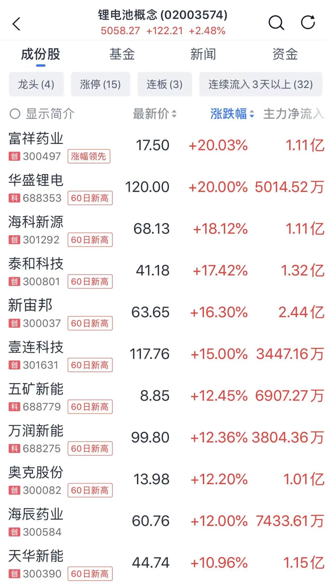 具体到个股,富祥药业、华盛锂电20%涨停,其中,富祥药业更是1秒涨停;海科新源涨超18%,泰和科技涨超17%,新宙邦涨超16%,壹连科技涨15%,维科技术、孚日股份、沧州明珠、联泓新科、新安股份、野马电池、中材科技、中利集团、融捷股份等十多股盘中亦涨停。