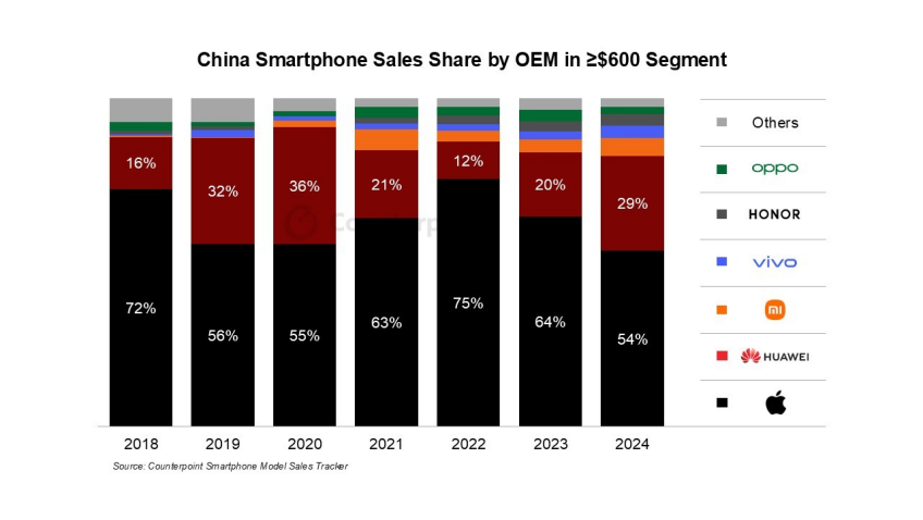 (全球范围内,市场调查机构Counterpoint Research发布的最新报告显示,2025年上半年全球高端智能手机销量排名靠前品牌中,荣耀同样未上榜。)