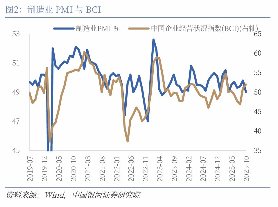 M1增速转为下行,主要来自高基数的扰动。M1增速结束连续5个月的上行转为下行可能来自以下四个原因:1、本月M0增速回落至10.6%(前值11.5%),回落速度加快;2、去年高基数的扰动本月M1减少1.15万亿元,基本符合季节性(2021-2023年的三年同期均值为-9713亿元),而去年同期M1仅减少526亿元;3、企业资金的活化程度可能有所降低。10月制造业PMI录得49.0%,环比有所走弱。10月BCI企业销售、利润前瞻指数亦出现环比下降。显示企业预期可能环比走弱;4、地产销售数据在10月明显下行,居民资金通过购房回流企业受到一定阻碍。