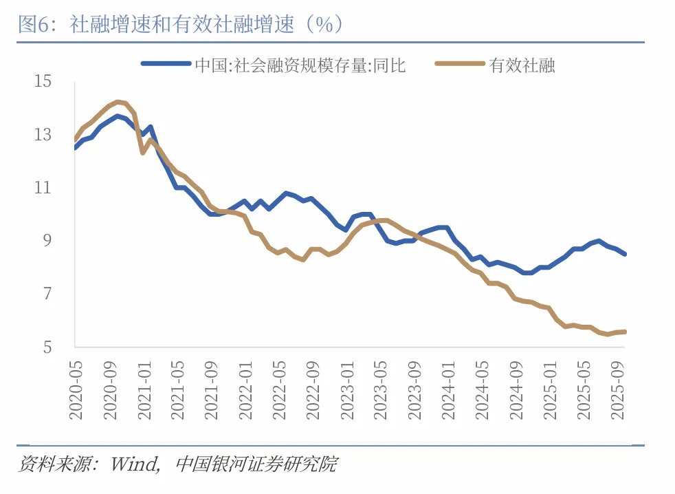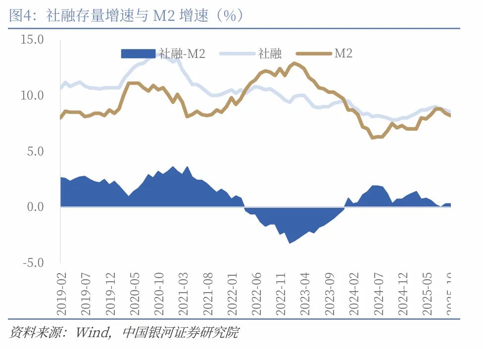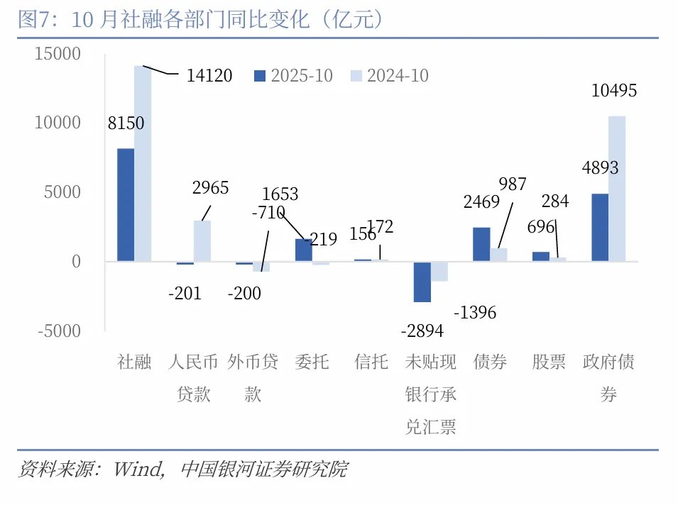 本月社融的拉动项来自企业直接融资、委托贷款和对实体的外币贷款,拖累项则主要来自政府债券融资、对实体的人民币贷款和未贴现银行承兑汇票。10月新增社融同比少增5970亿元,同比多增的项目包括企业直接融资、委托贷款和对实体的外币贷款,分别同比多增1894亿元、1872亿元和510亿元。同比少增的项目则主要包括政府债券融资、对实体的人民币贷款和未贴现银行承兑汇票,分别同比少增5602亿元、3166亿元和1498亿元。委托贷款同比大幅多增,主要来自新型政策性金融工具投放的带动。进入5月以来市场对于人民币升值预期升温,叠加中国企业的出海需求,这会增加外币贷款需求,外币贷款连续同比多增。政府债券融资增速连续三个月下行,增速为19.2%(前值20.2%),去除政府融资的社融增速为5.92%(前值5.94%),环比上月亦下降。今年和去年政府债券发行节奏错位,去年政府债券从8月开始加速发行,由于基数效应,四季度政府债券融资对社融增速的拉动作用可能减弱。有效社融增速(中长期贷款+委托+信托+直接融资)为5.57%(前值5.56%),连续两个月上行。