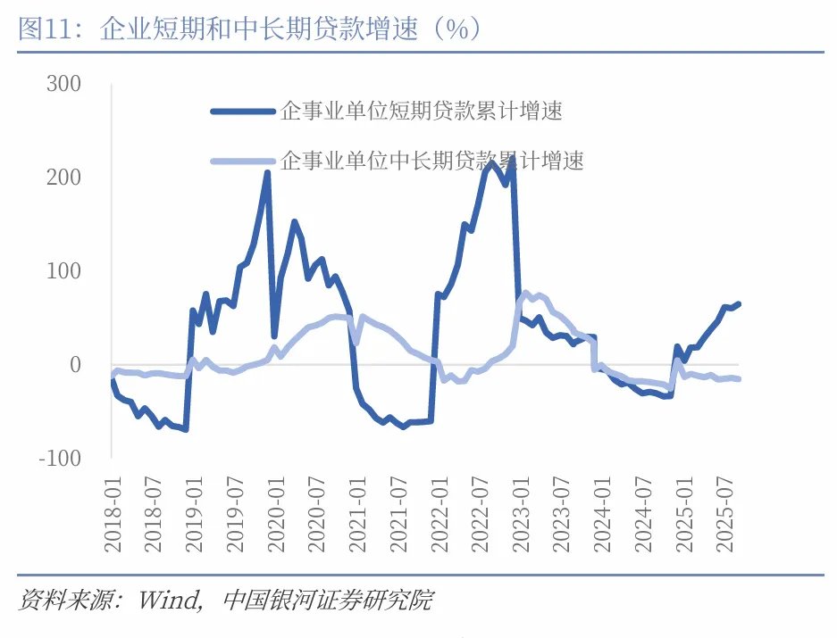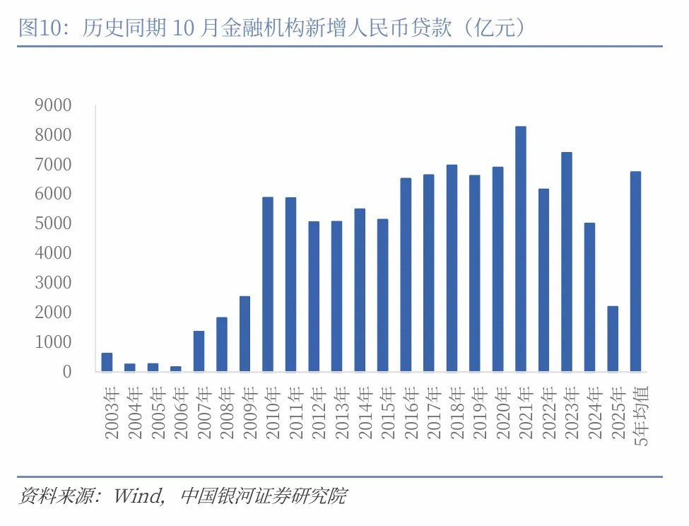 贷款同比少增,居民贷款同比少增、企业信贷好于去年同期。10月金融机构新增人民币贷款2200亿元,同比少增2800亿元。居民短贷同比少增3356亿元,居民中长期贷款同比少增1800亿元。10月30大中城市商品房成交面积同比减少26.6%,地产销售数据的走弱可能是本月居民中长期贷款同比少增的主要原因。企业信贷同比多增主要来自票据融资的支撑,企业短贷与去年持平,企业中长贷同比少增1400亿元。票据融资同比多增3312亿元,10月末票据利率明显下行,可能存在一定的票据冲量现象。非银贷款同比少增164亿元。