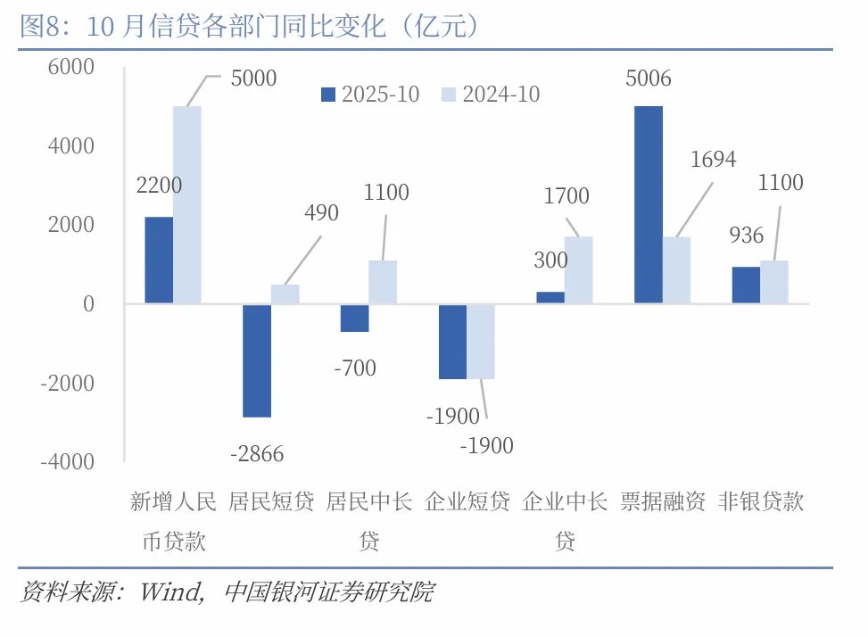 10月金融机构新增人民币贷款2200亿元,同比少增2800亿元。居民短贷同比少增3356亿元,居民中长期贷款同比少增1800亿元。10月30大中城市商品房成交面积同比减少26.6%,地产销售数据的走弱可能是本月居民中长期贷款同比少增的主要原因。企业信贷同比多增主要来自票据融资的支撑,企业短贷与去年持平,企业中长贷同比少增1400亿元。票据融资同比多增3312亿元,10月末票据利率明显下行,可能存在一定的票据冲量现象。非银贷款同比少增164亿元。