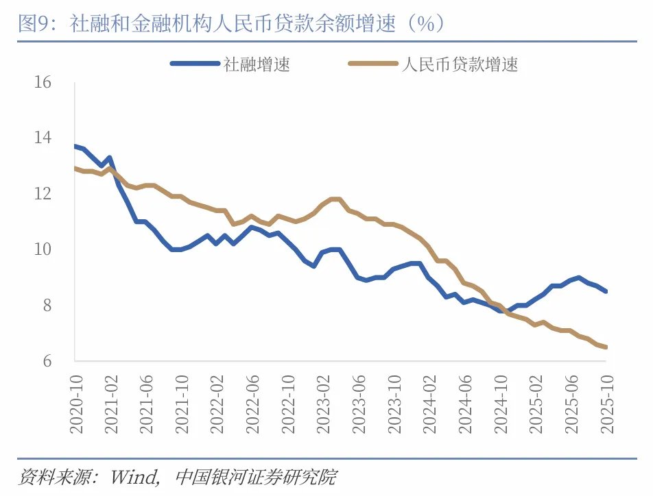 2025年11月13日,央行发布2025年10月金融数据。10月M1同比6.2%(前值7.2%),M2同比8.2%(前值8.4%)。新增社融8150亿元,同比少增5970亿元,社融增速8.5%(前值8.7%)。金融机构新增人民币贷款2200亿元,同比少增2800亿元,贷款增速6.5%(前值6.6%)。