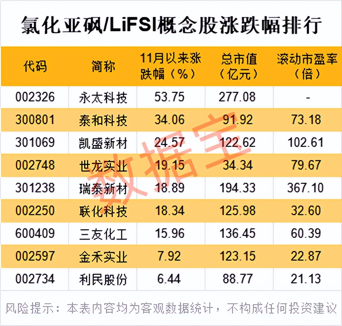 作为电解液又一关键原料的氯化亚砜,A股4只概念股在昨日午后也快速拉升,其中三友化工涨停,世龙实业午后一度涨停,凯盛新材盘中最高上涨近16%,金禾实业涨近5%。