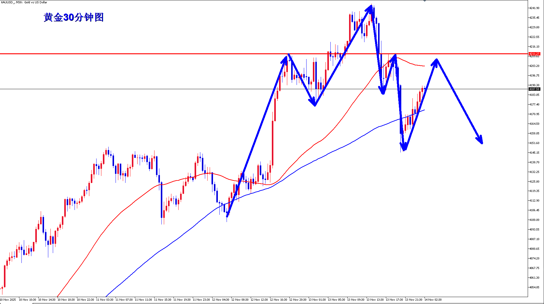 黄金30分钟昨天下跌之后,黄金30分钟短线已经形成头肩顶结构,黄金当前阻力4210附近一线,黄金早盘反弹承压4210,那么黄金还是可以继续顺势空,黄金日线反弹结束了吗?黄金当前30分钟均线已经开始向下拐头,如果继续向下形成死叉,那么黄金30分钟将继续打开进一步下跌空间。